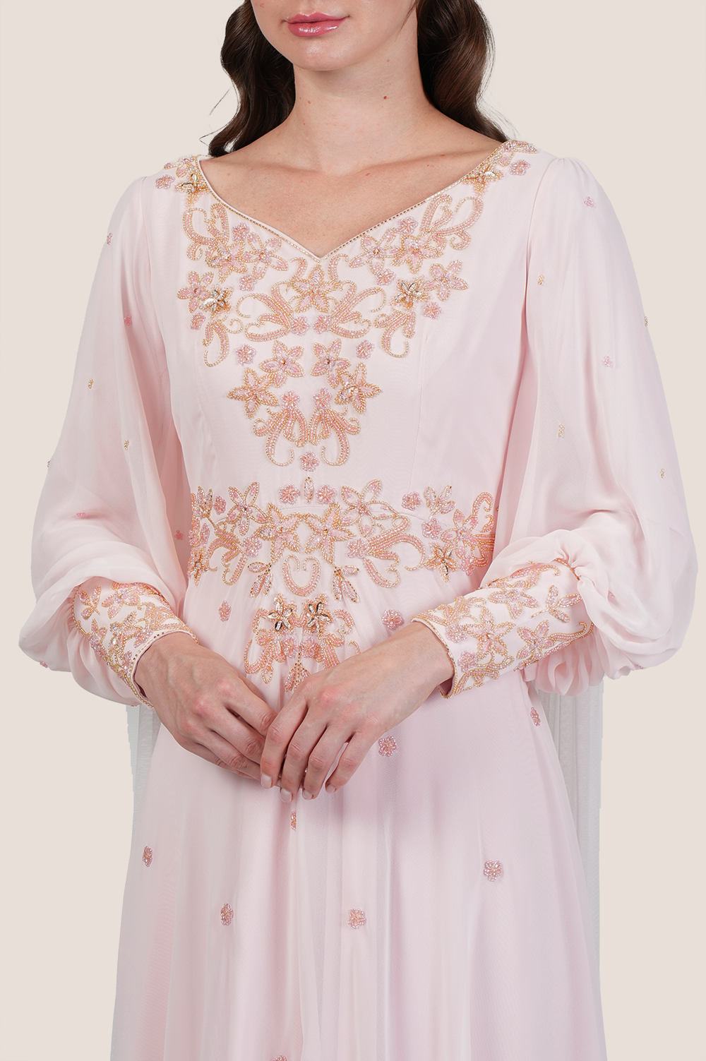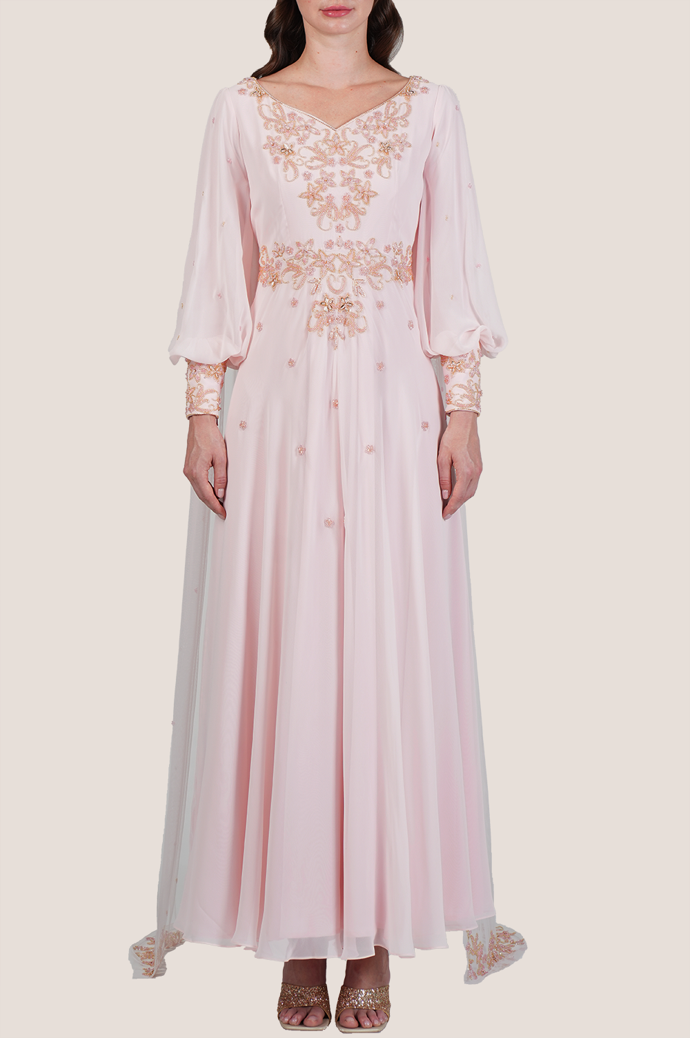Step into refined sophistication with the Chintz Rose Dress with Draped Veil and Floral Embellishments, a luxurious statement piece designed for timeless elegance. Crafted from premium crepe fabric, this dress features a soft chintz rose tone adorned with intricate gold crystal beading, sequin detailing, and delicate floral hand embroidery that radiates grace and charm. The unique leaf-inspired sweetheart neckline adds a romantic touch, while bishop sleeves create a regal silhouette. Flowing effortlessly from both shoulders is a dramatic draped cape veil, finished with elegant handwork for a breathtaking back view. Perfect for weddings, formal events, evening parties, and luxury modest fashion, this 58-inch full-length design offers a blend of comfort, artistry, and sophistication. The model is 174–179 cm tall and wears size S — a dreamy addition to any statement wardrobe.