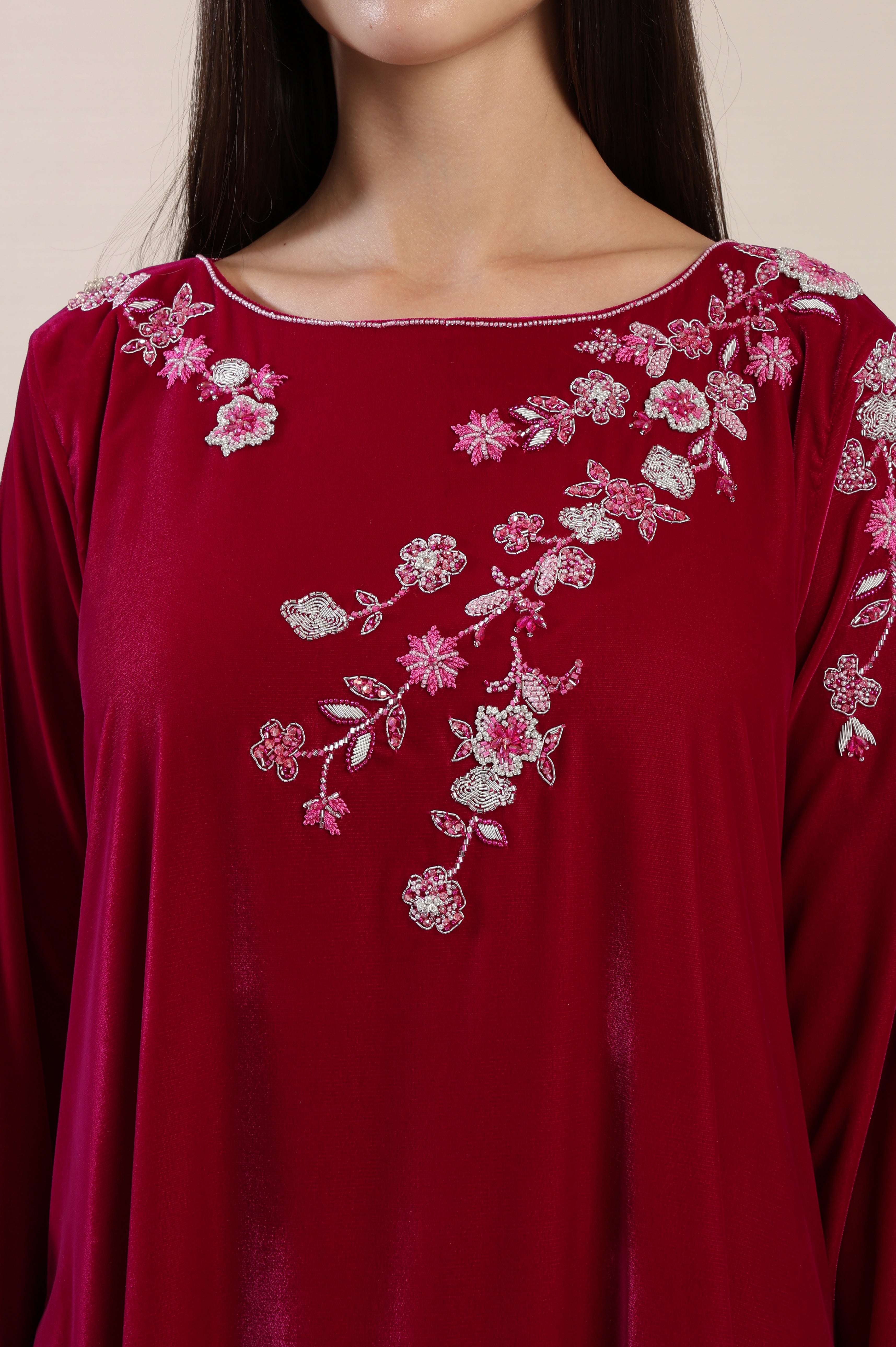 Elevate your evening wardrobe with this striking barberry velvet dress designed for women who appreciate bold elegance and refined craftsmanship. Crafted from rich velvet fabric, this dress offers a smooth, luxurious texture while maintaining a graceful and modest silhouette perfect for festive gatherings and formal occasions. The neckline and upper bodice are beautifully enhanced with intricate floral beaded handwork, adding shimmer and delicate detailing that elevates the overall design. The sleeves feature elegant hanging embellishment accents that introduce movement and a refined finishing touch. Soft tulle panels along the sides add dimension and contrast, creating a subtle layered effect that enhances flow and sophistication. Perfect for celebrations and evening events, this dress blends rich color, handcrafted detail, and graceful structure to create a memorable statement look.
