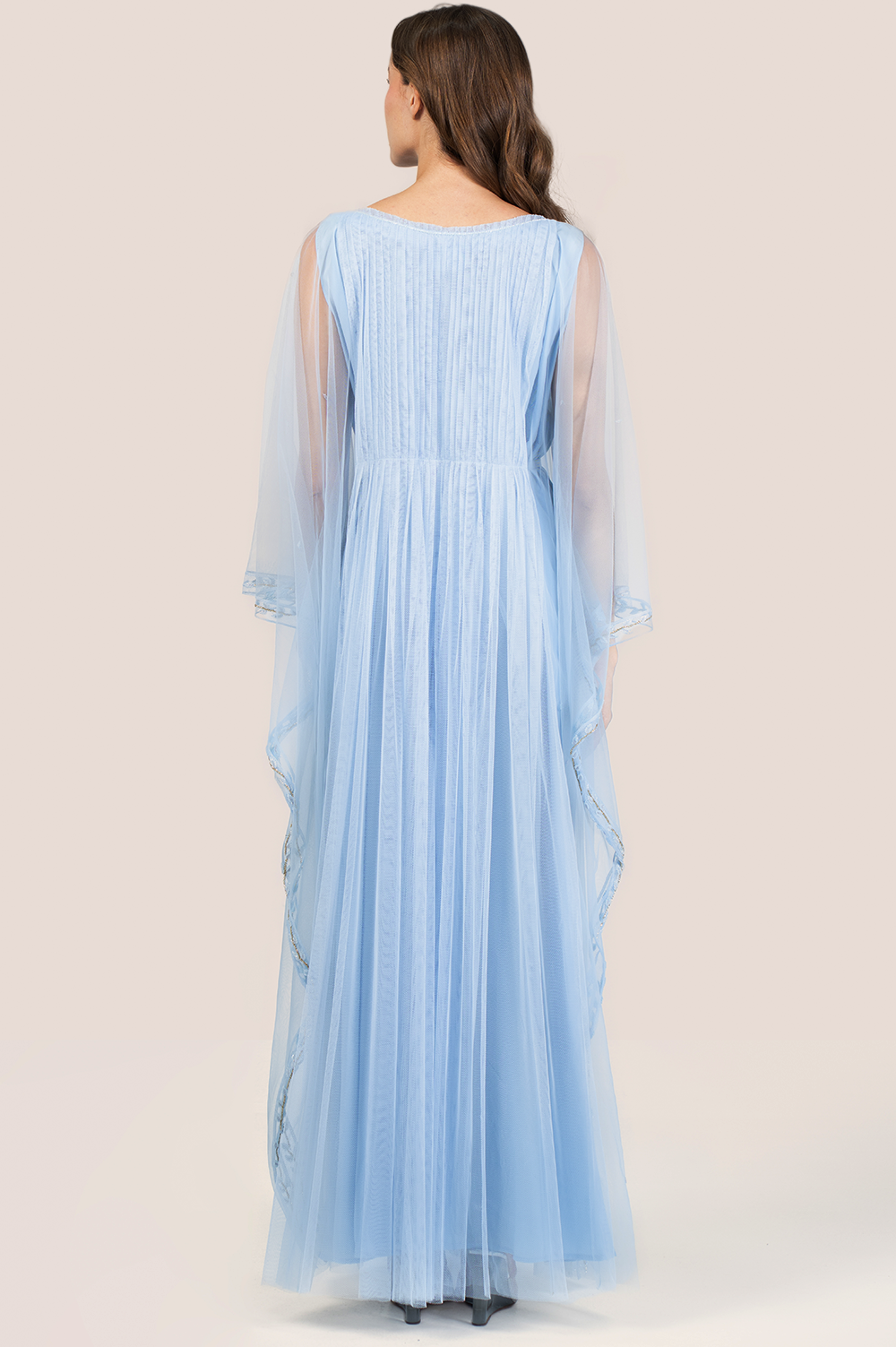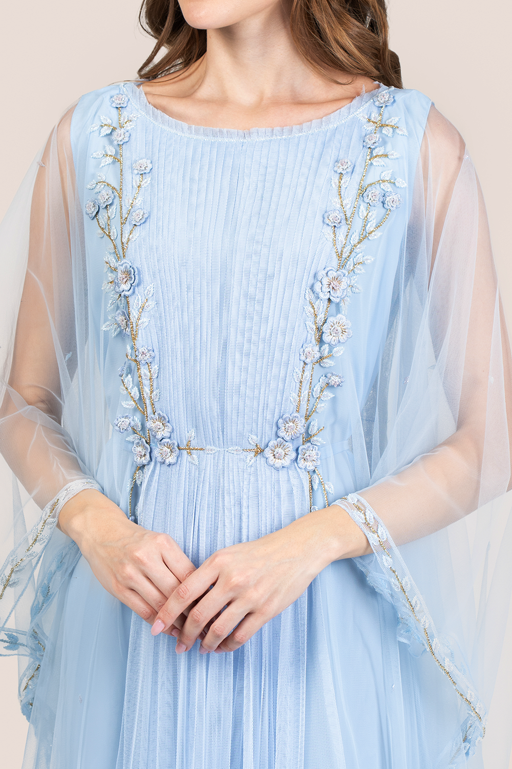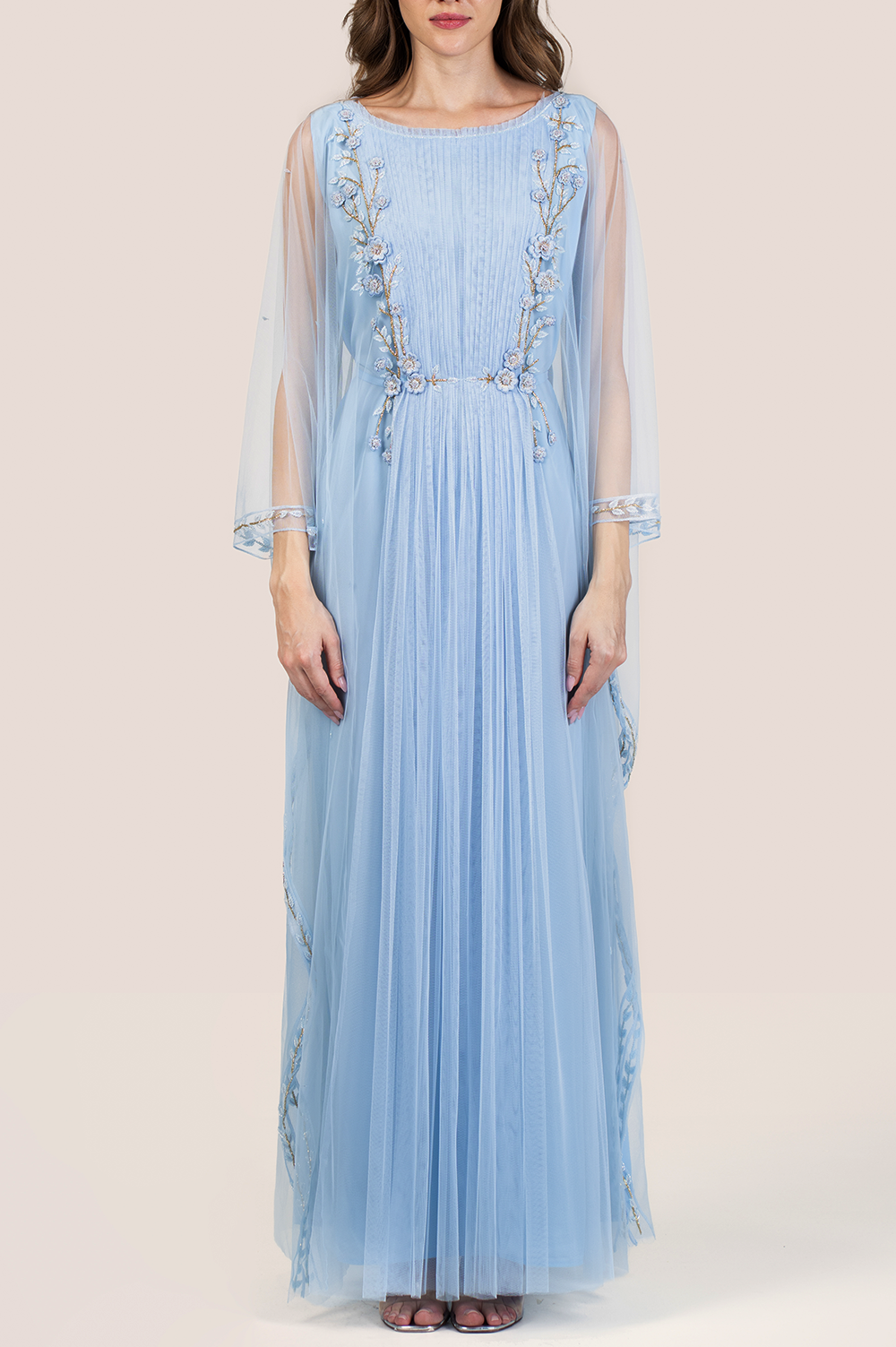Float into effortless elegance with the Nantucket Breeze Thoub — a dreamy creation designed to evoke the serene charm of coastal winds and floral grace. Crafted from soft, flowing chiffon and delicately layered with an attached tulle inner, this thoub offers a light, ethereal feel with every movement. The silhouette is elevated by intricate floral handwork, meticulously placed to add dimension, texture, and a touch of romantic detail. The soft, airy nature of the fabric combined with the whimsical embroidery makes this piece perfect for garden soirées, Eid gatherings, or any occasion where you want to exude quiet luxury. With its balance of comfort, femininity, and refined craftsmanship, the Nantucket Breeze Thoub brings a fresh breath of style to your wardrobe — serene, sophisticated, and stunning in every way.