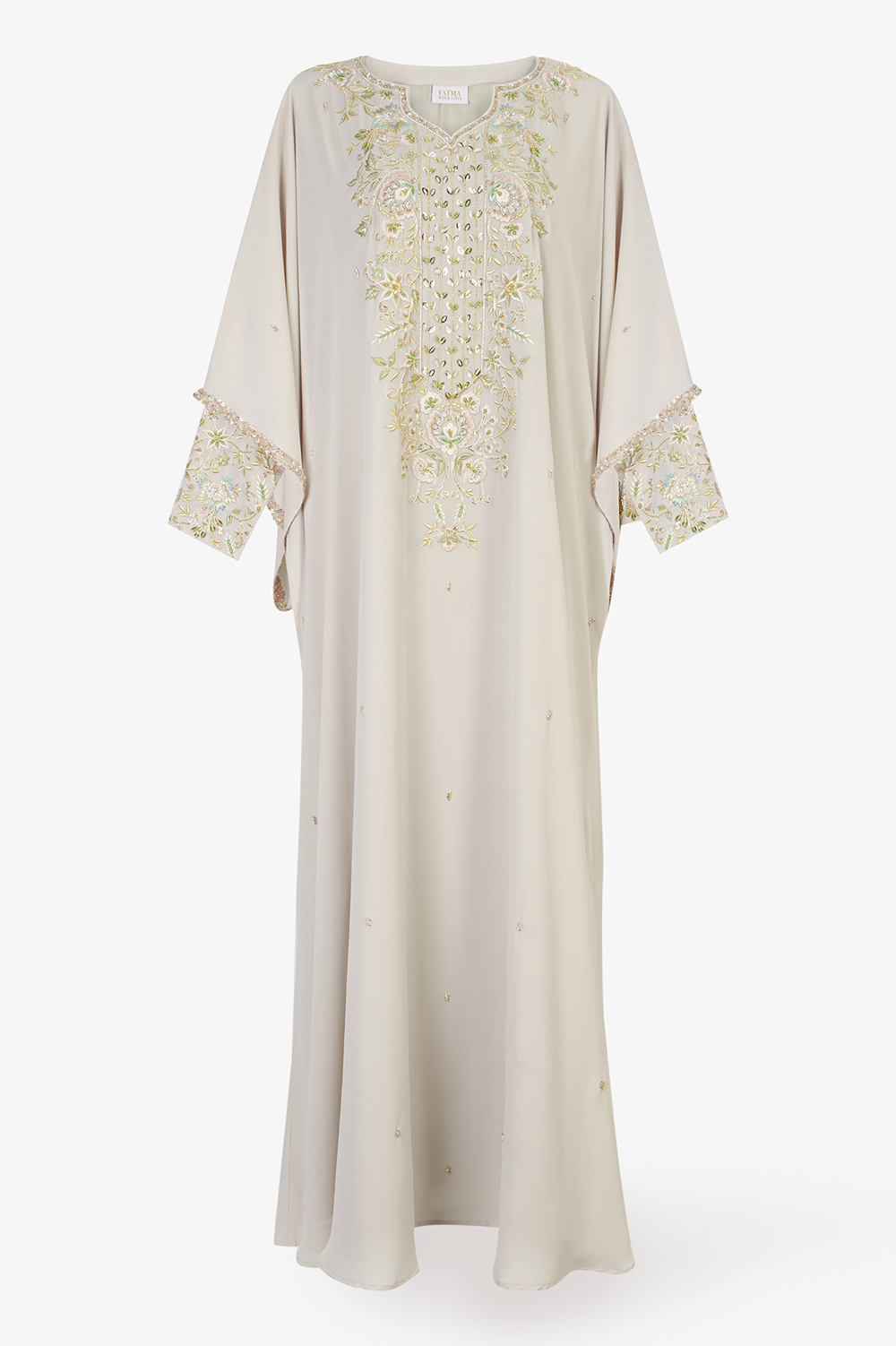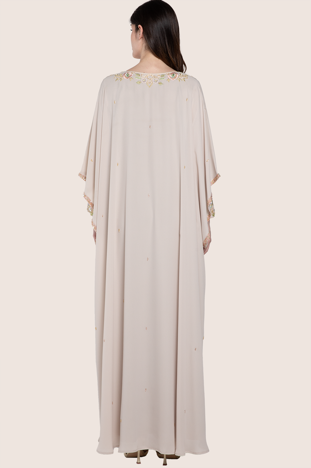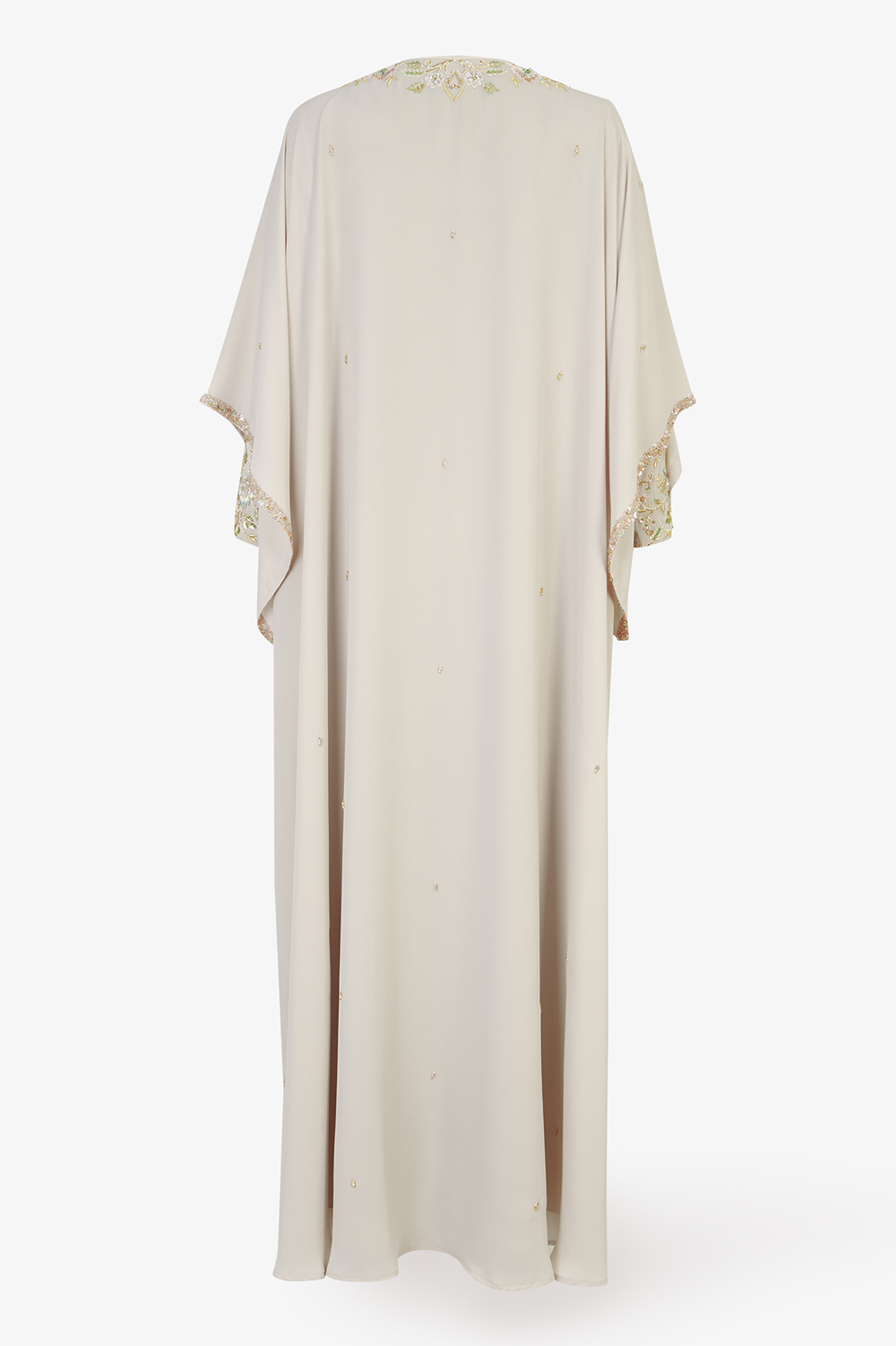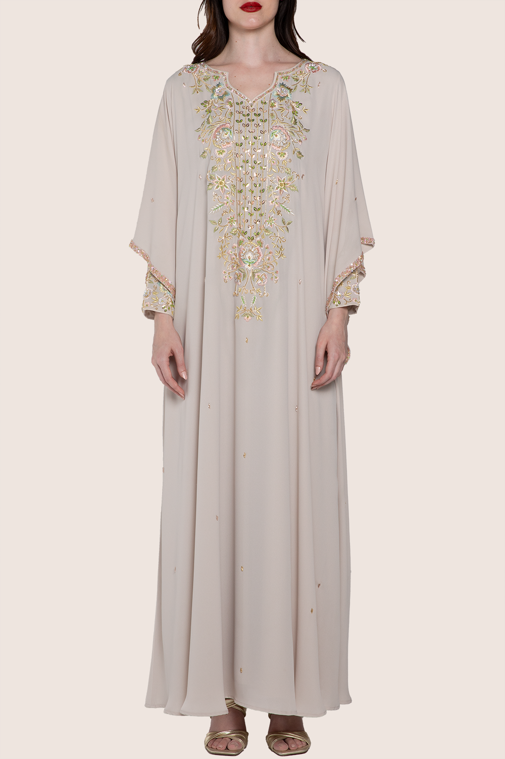 Step into a world of ethereal beauty with the Summer Sand Thoub, a creation that transcends time and trends. Enveloped in soft pastel hues, this masterpiece whispers elegance with every detail. The exquisite floral embroidery in shades of blush pink, serene green, and opulent gold weaves a story of nature’s grace, while shimmering gold beaded accents elevate the design to breathtaking artistry. Like a delicate scripture etched in fabric, this thoub captivates the eye and steals the spotlight at any grand occasion. Its flowing silhouette, lined with plush crepe, offers an unparalleled blend of luxury and comfort, making it as effortless to wear as it is enchanting to behold. With a regal 58-inch length and an aura of majestic charm, the Summer Sand Thoub is not just a garment it’s an experience. As the model, standing 174-179 cm tall, dons this size M treasure, the intricate craftsmanship and luminous design come alive, making an unforgettable impression.