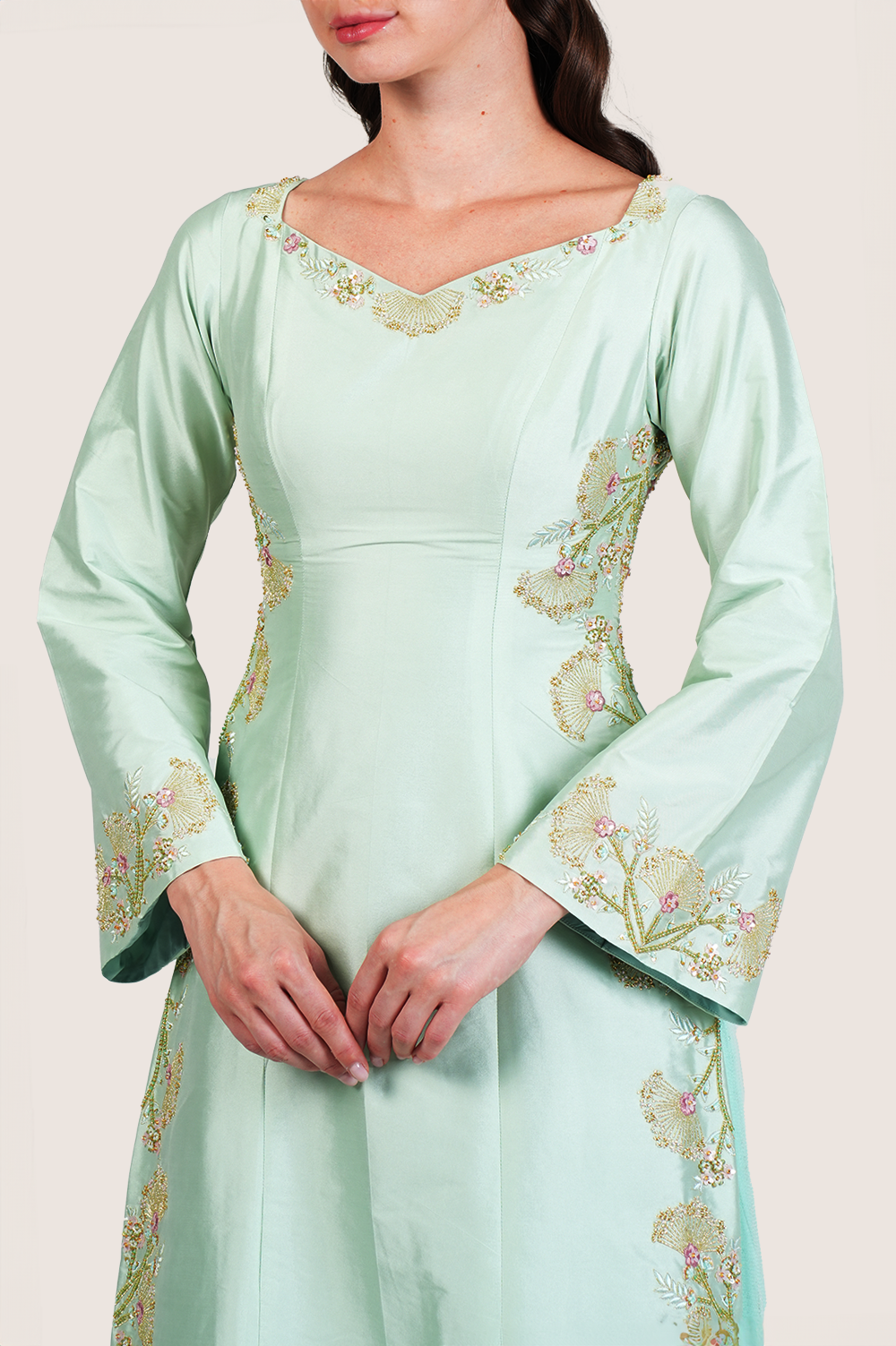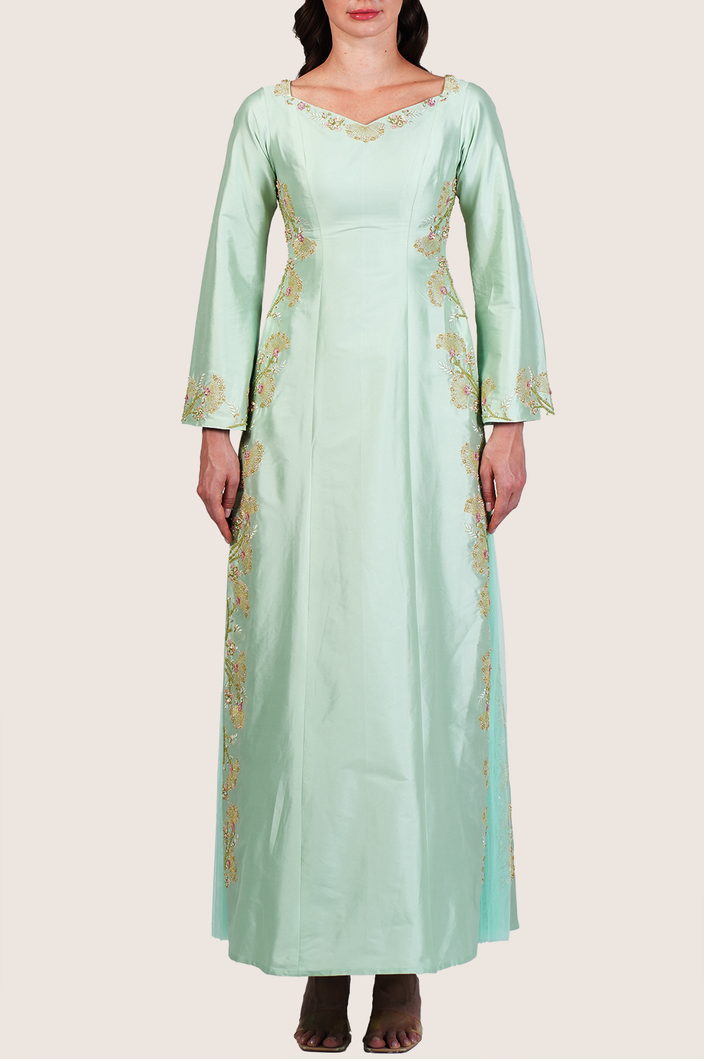 Grace your moments with the Veiled Vista Dress, a serene and luxurious ensemble crafted from premium taffeta fabric in a soft smoke green hue. This elegant piece features delicate floral machine embroidery throughout, enhanced with minimal handwork using pastel green crystals, gold beads, and subtle sequins — creating a gentle, light-catching finish across its refined silhouette. A smooth crepe inner lining ensures breathable comfort, while side slits below the waist reveal soft tulle inserts, adding an ethereal touch and graceful movement to the design. The 58-inch full length flows effortlessly, making it ideal for weddings, formal events, evening wear, and luxury modest fashion. A poetic balance of modesty and modernity, the Veiled Vista Dress is perfect for those who appreciate designer craftsmanship, soft sophistication, and thoughtful detailing. The model is 174–179 cm tall and wears size S — a timeless and enchanting piece for any refined wardrobe.